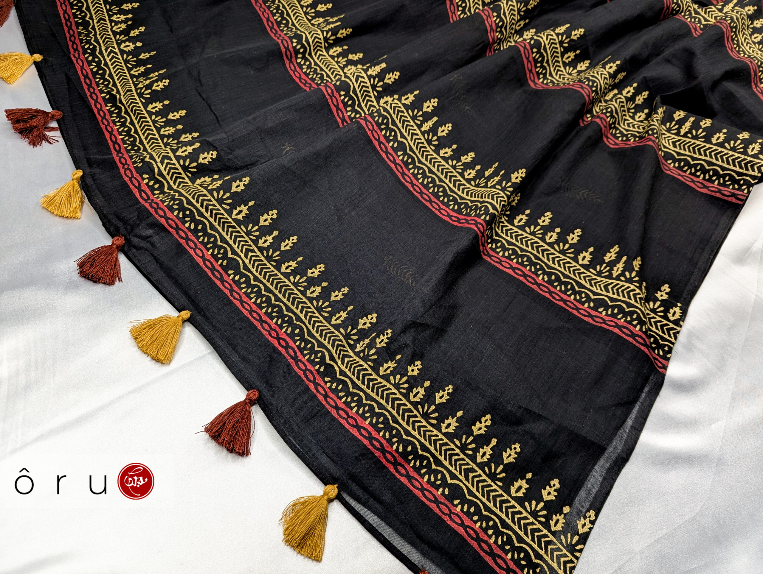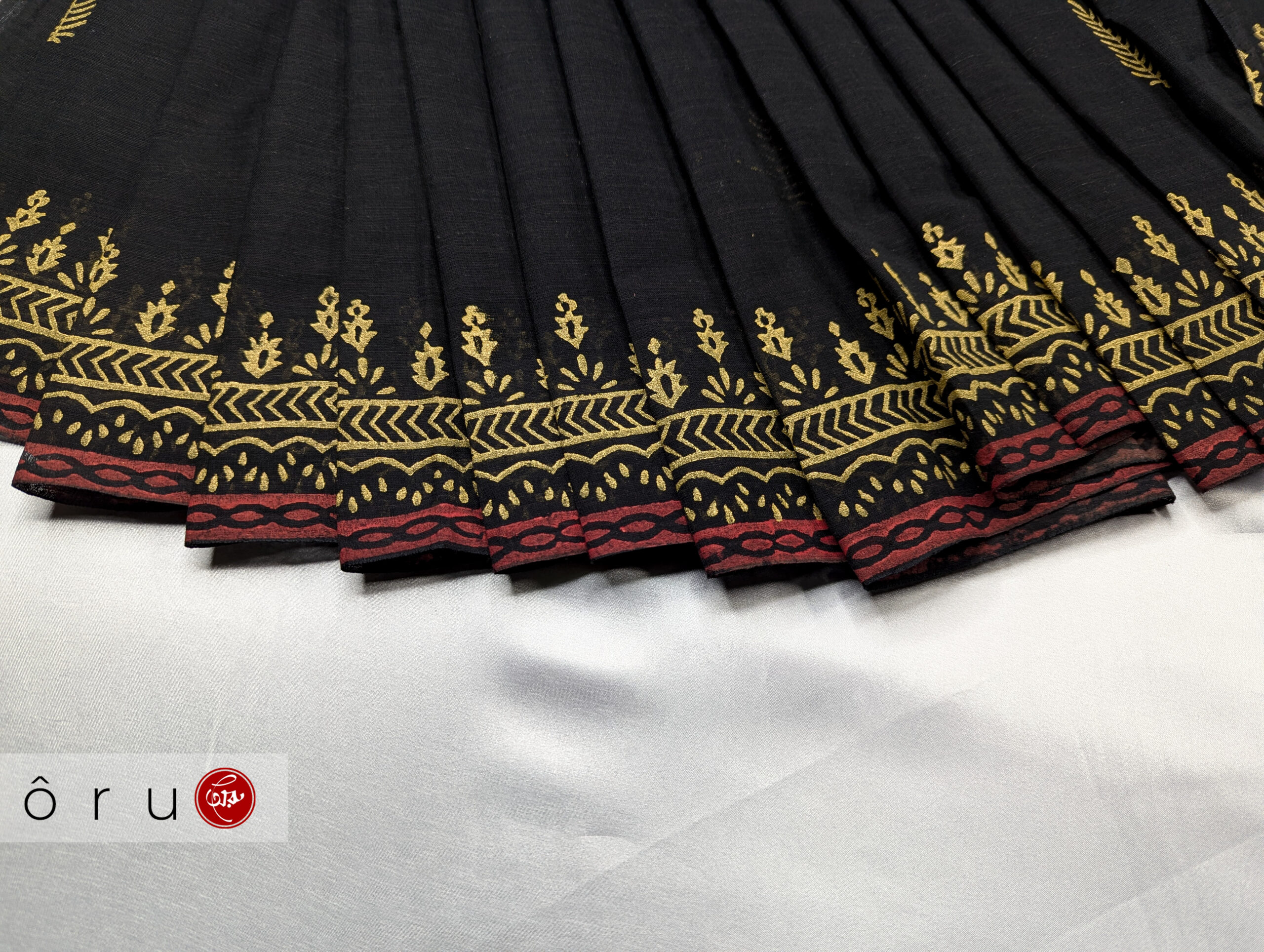 বিবরণ : পুরো শাড়ীতে নিজস্ব নকশার আদলে কাঠ ব্লকের কাজ করা।