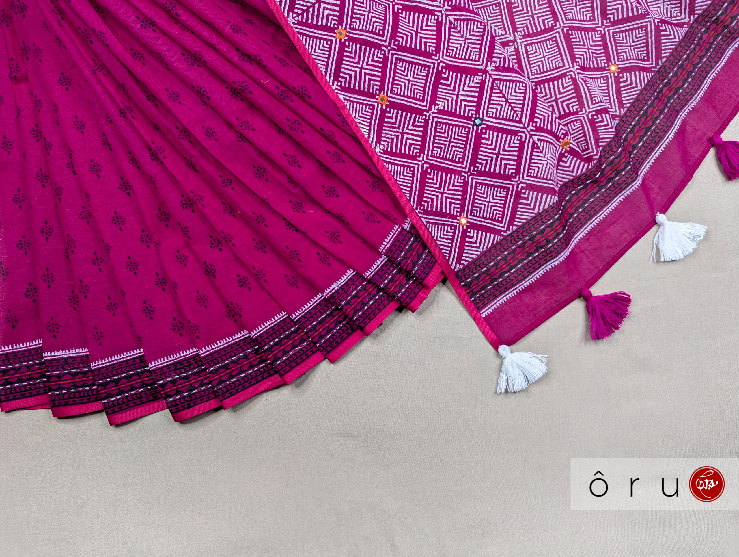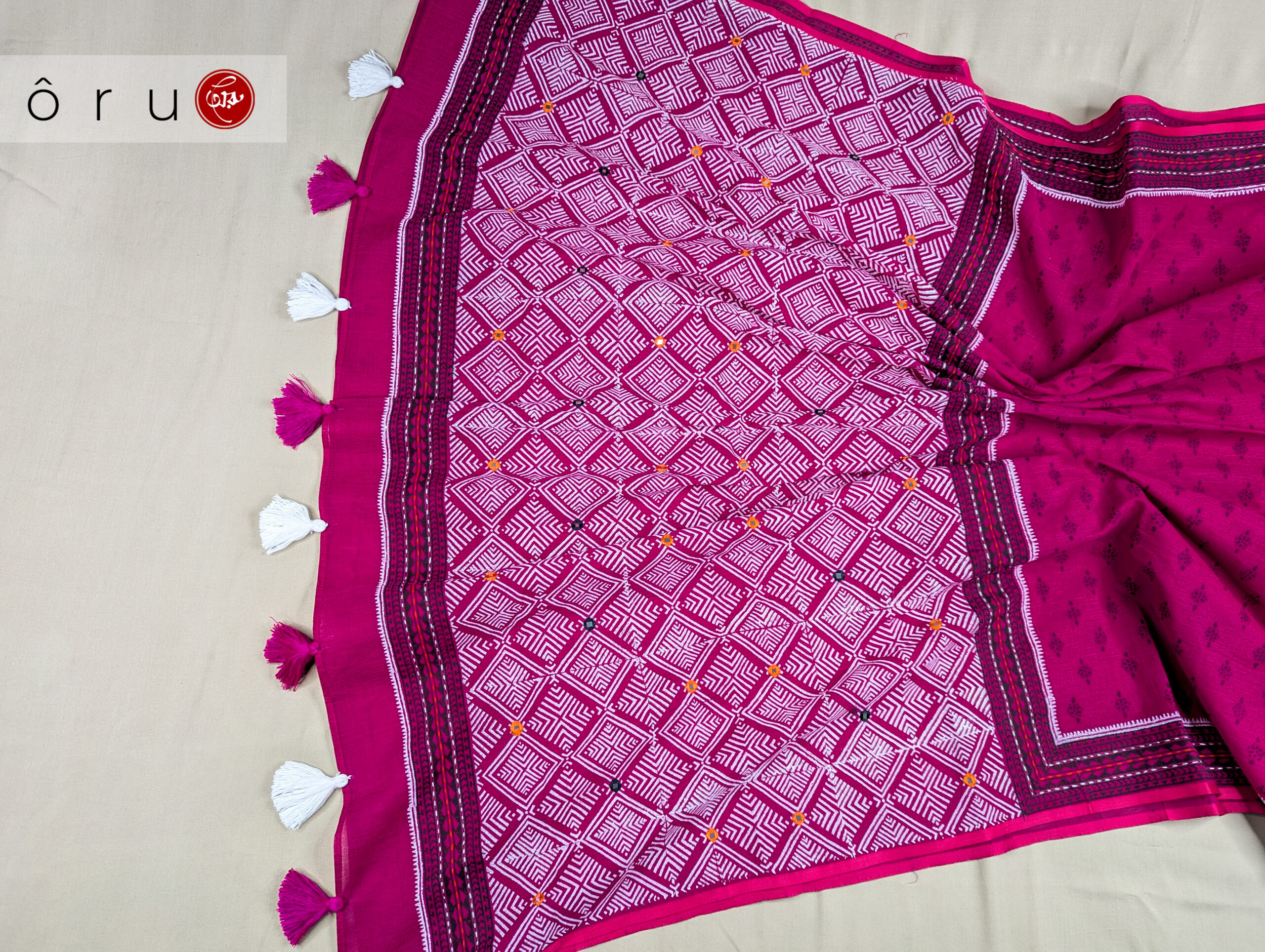 বিবরণ : পুরো শাড়ীতে ব্লকের কাজ করা , জমিনে, পাড়ে ও আঁচলে সুতার কাঁথা সেলাই করা। আঁচলে ডলার বসানো।